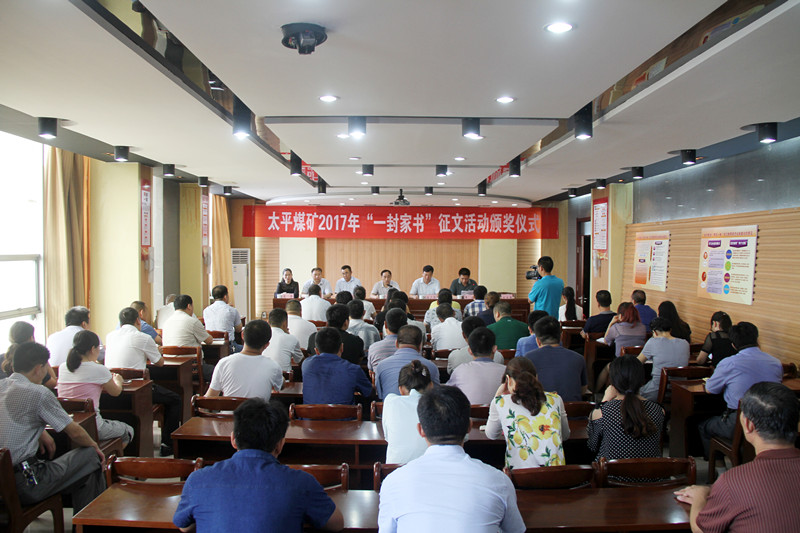 7月 19 日,太平煤矿在机关办公楼六楼会议室举行"一封家书"有奖征文颁奖仪式,标志着矿井"情系安全 、深切叮咛"系列活动步入收尾阶段。矿党委书记汤保民、机电副矿长任广华、生产副矿长赵子友、安全副矿长王谏出席颁奖仪式,工会办公室、安全科等单位负责人,获奖职工、家属及来自各工区、科室的干部职工100余人参加颁奖仪式。