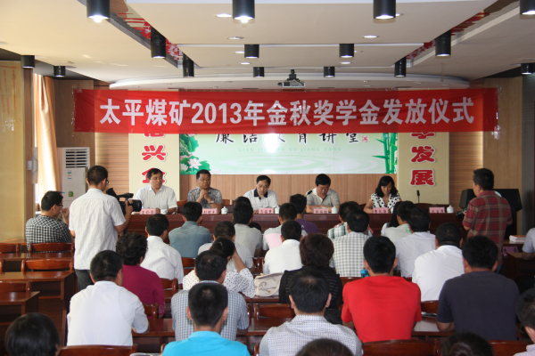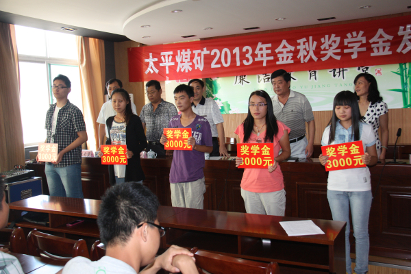 9月1日,太平煤矿"金秋奖学"金发放仪式在行政办公楼六楼会议室隆重举行,共为今年考入吉林大学、山东农业大学、烟台大学等高校的职工子女发放奖学金8.3万元。这为职工子女喜圆大学梦又助一臂之力,标志着该矿2013年"金秋奖学"活动圆满落幕,在全矿上下引起强烈反响。